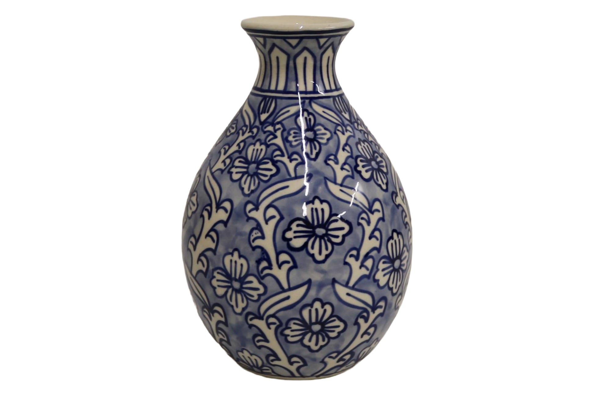 Bring timeless charm to your home with the Home&Manor Classic Ceramic Bottle Vase, a stunning piece of hand-painted artistry! Featuring a graceful rounded silhouette that narrows into a delicate neck, this vase showcases intricate floral motifs in a rich blue color against a light blue backdrop. The detailed patterning highlights the craftsmanship of each piece, making it not just a vase, but a work of art. Whether displayed as a statement piece on its own or filled with fresh or dried blooms, this ceramic vase brings elegance and sophistication to any setting. Perfect for enhancing a mantel, entryway, dining table, or cozy nook, it is a versatile accent that seamlessly blends with both traditional and modern décor.