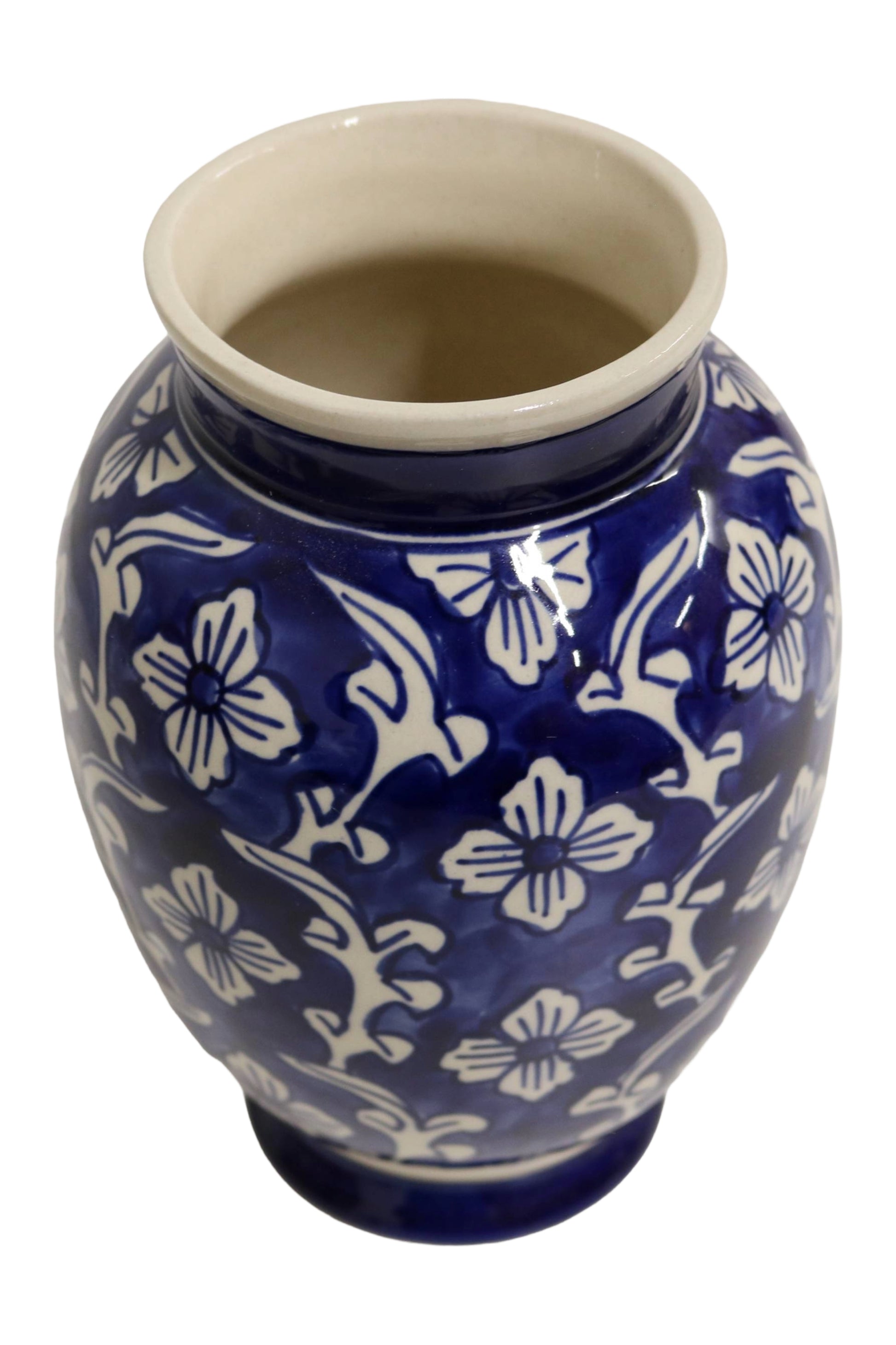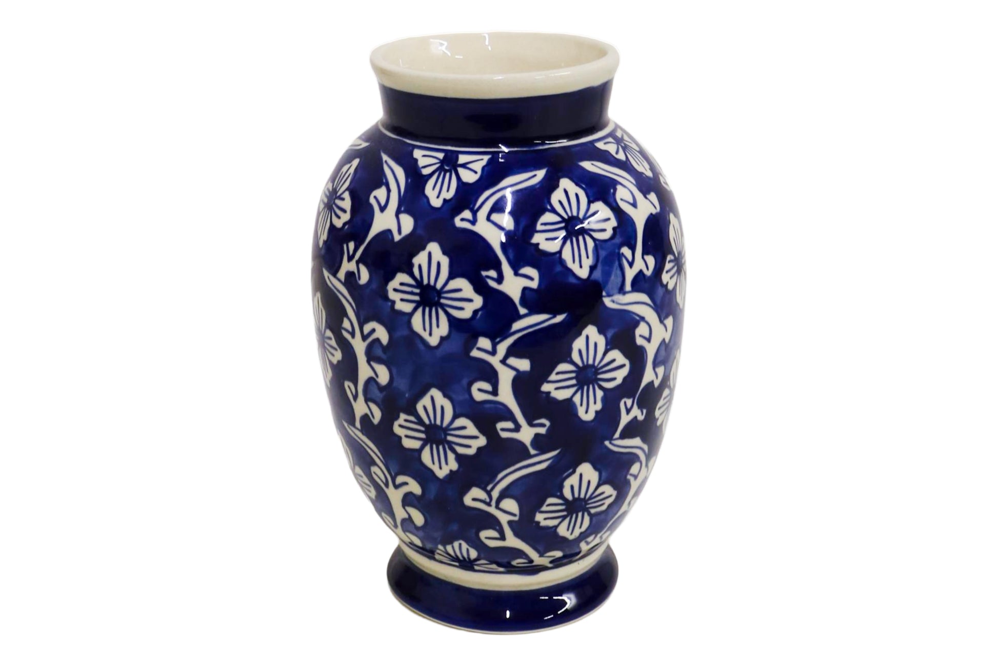 Bring timeless elegance into your home with the Home&Manor Classic Ceramic Vase! Meticulously hand-painted by skilled artisans, this vase showcases a traditional rounded silhouette, beautifully adorned with a white floral motif over a bold dark blue backdrop. The rich detailing and high-quality ceramic finish make it a striking statement piece, whether displayed on its own or filled with fresh or dried arrangements. With its classic form and artisanal charm, this vase seamlessly complements both traditional and modern interiors, making it a perfect addition to any home décor.