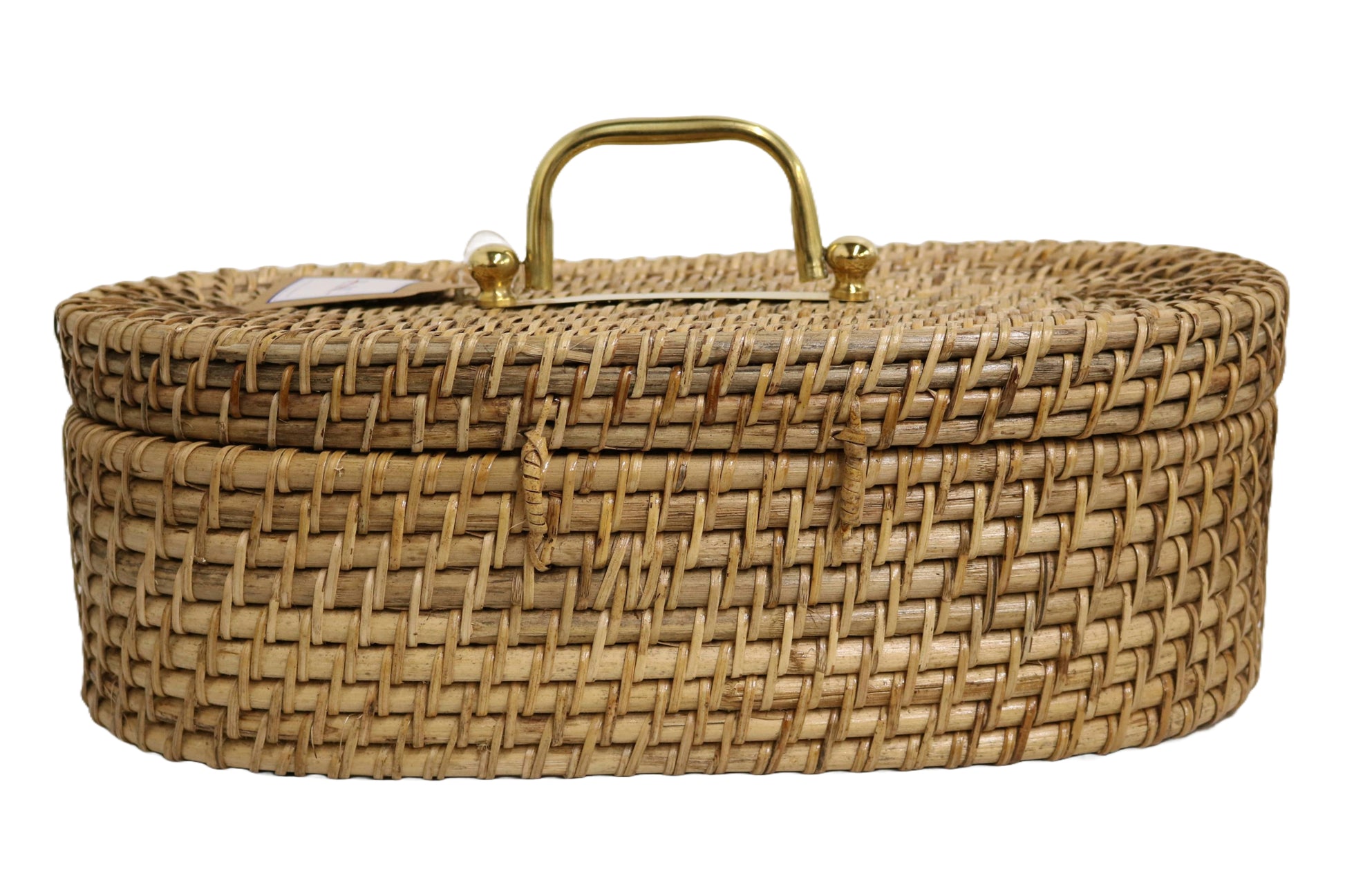 Introducing our charming Home&Manor Small Wicker Lidded Box with Shiny Brass Accessories! Home&Manor Wicker Baskets are a must-have addition for any home. This delightful lidded box features a shiny brass handle and accessories that add a touch of sophistication to its rustic design, making it a stylish addition to any home decor. Crafted from high-quality wicker, this box is not only visually appealing but also sturdy and durable. Measuring just the right size for various uses, it's perfect for organizing small items like keys, remotes, cosmetics, special momentos and more! The natural texture of the wicker combined with the gleaming brass handle creates a timeless look that effortlessly enhances any space. The sturdy brass hasp is perfect for adding small lock for added security when needed. Whether displayed on a shelf, tucked into a bookcase, or used as a centerpiece on a table, this box adds both functionality and charm to your home. With its compact size and convenient handle, this Wicker Box is easy to carry and move around as needed. Bring a touch of sophistication and organization to your living space with this versatile and stylish lidded box today!